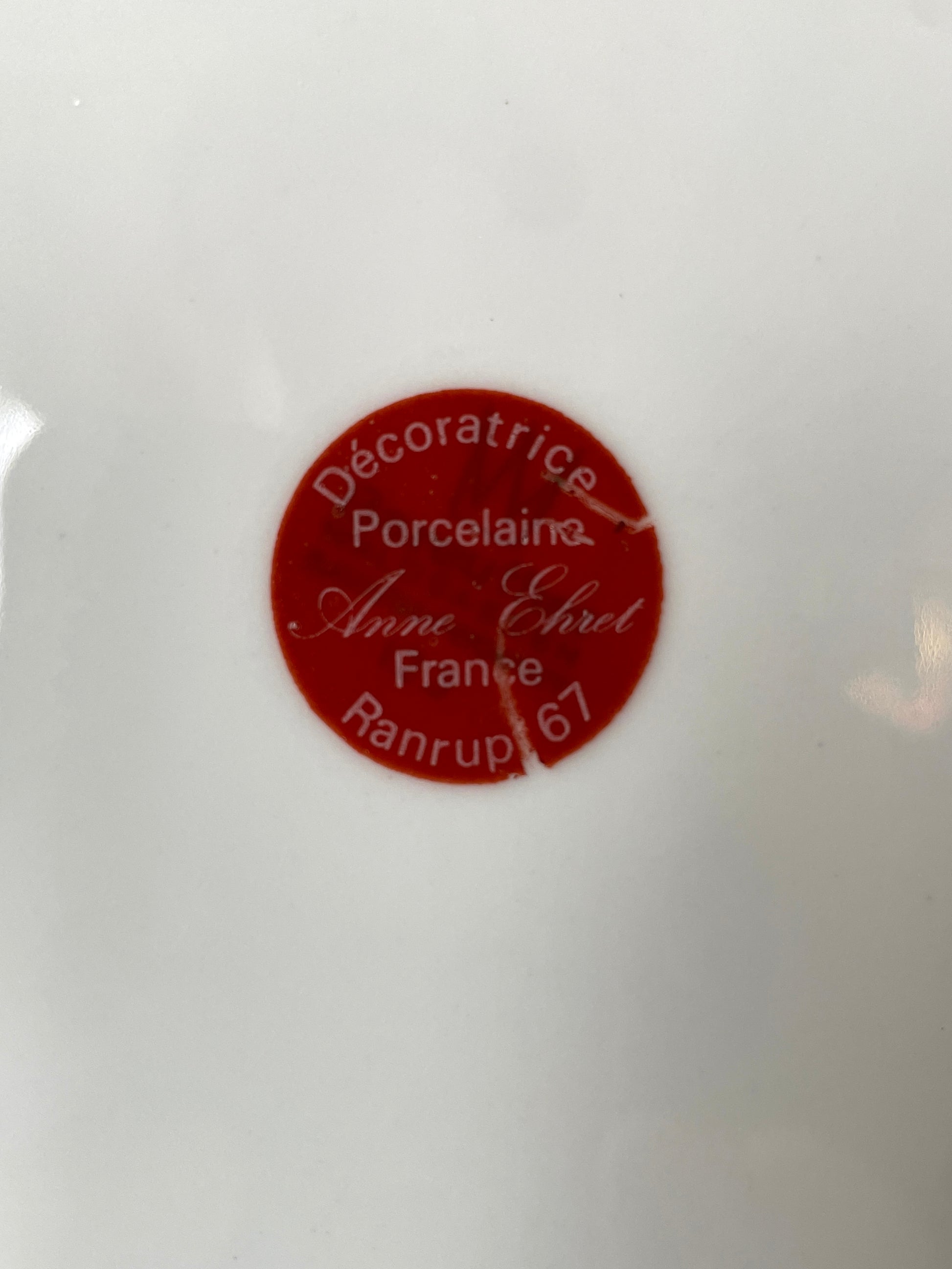 La pièce est signée au dos d'une pastille rouge mentionnant le nom de la décoratrice en porcelaine Anne Ehret (maison installée à Ranrupt en Alsace dans les années 70).