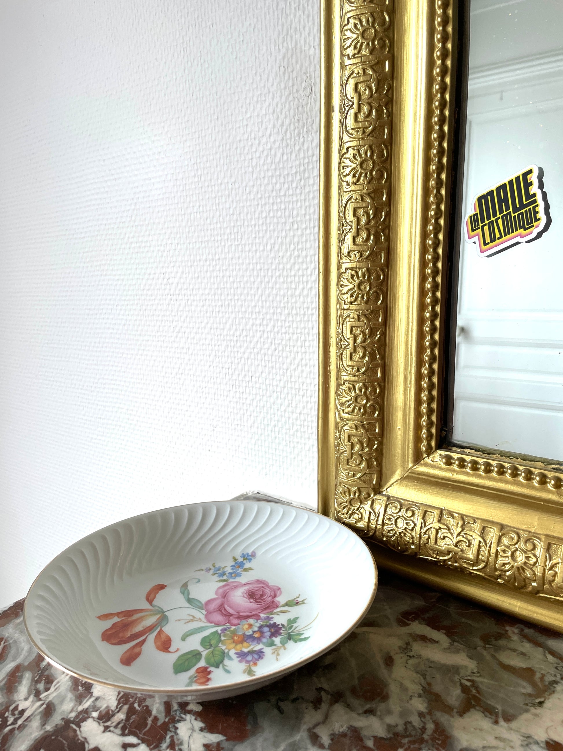 Assiette en porcelaine blanche et fine décorée d'un motif floral délicat dans des teintes rose, rouge, violet et bleu. Le bord de l'assiette présente une fine dorure.