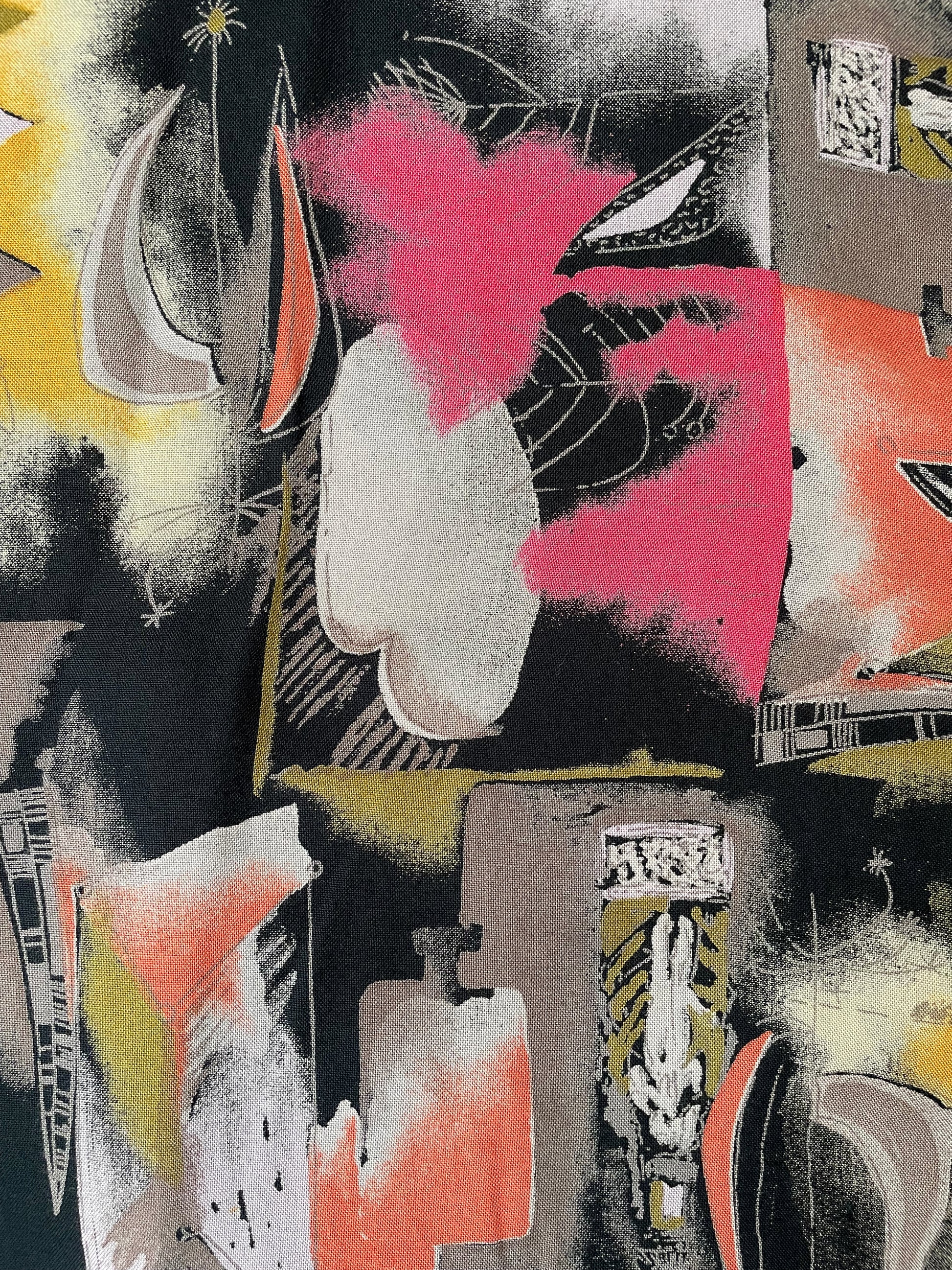 Chemise fluide noire et motifs abstraits jaunes, oranges et roses. Peps et confort à adopter.