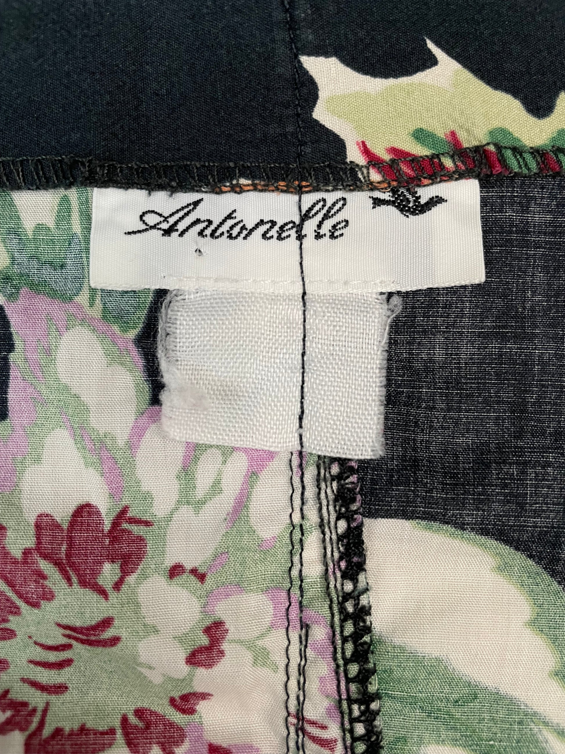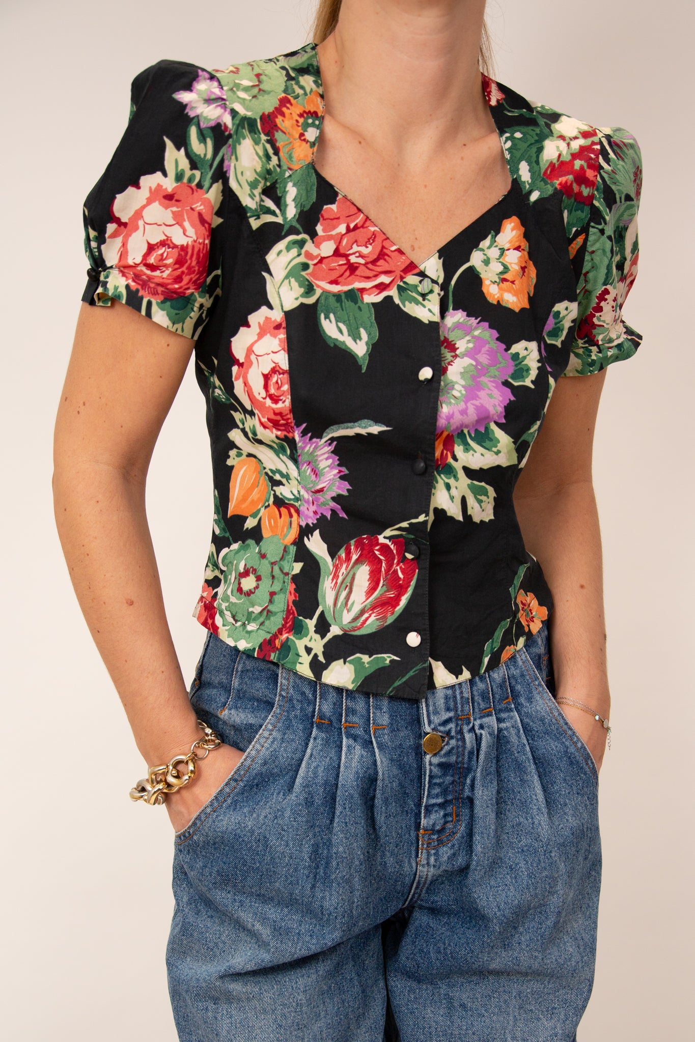 Chemisier noir avec imprimé floral, manches courtes et coupe cintrée. Antonelle, marque française qui a vu le jour en 1988. On aime sa touche rétro colorée des années 90.