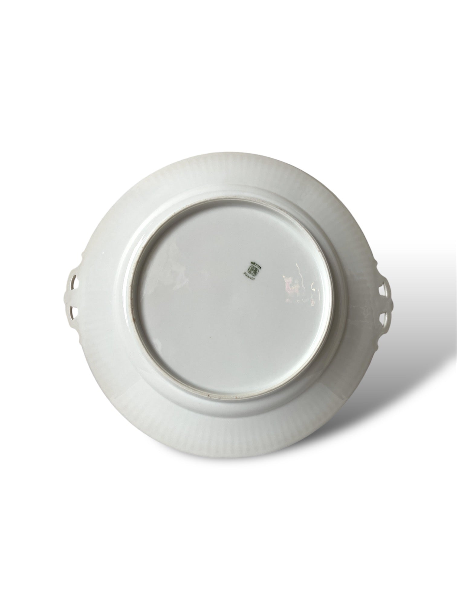 Petit plat en porcelaine blanche, à anses finement travaillées et avec un bord orné d’une fine dorure.