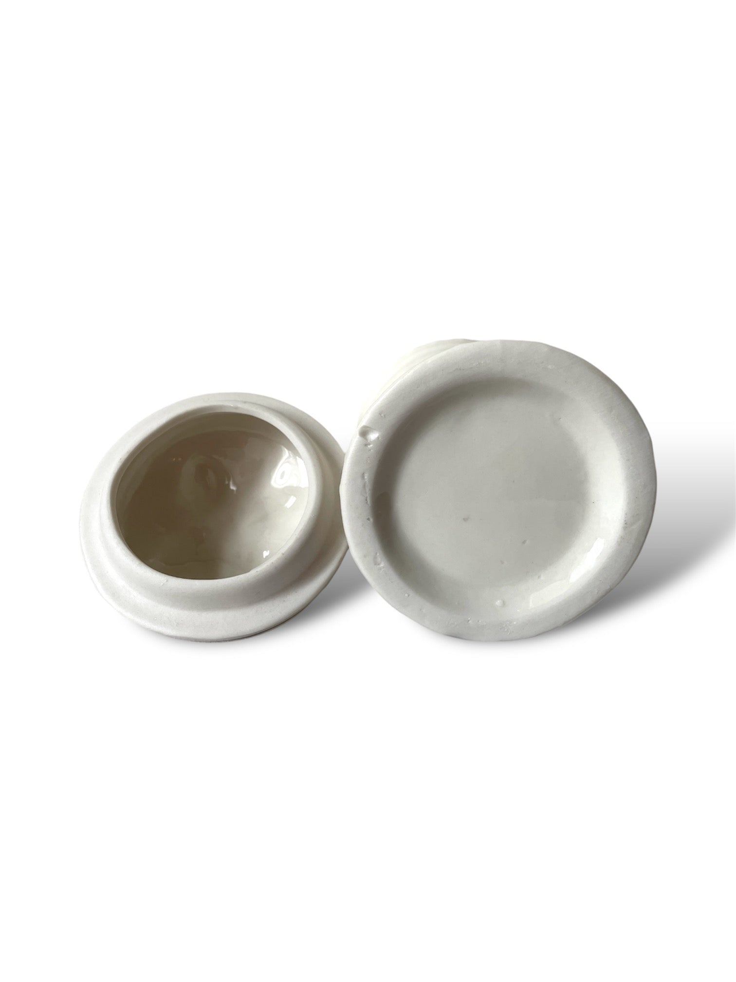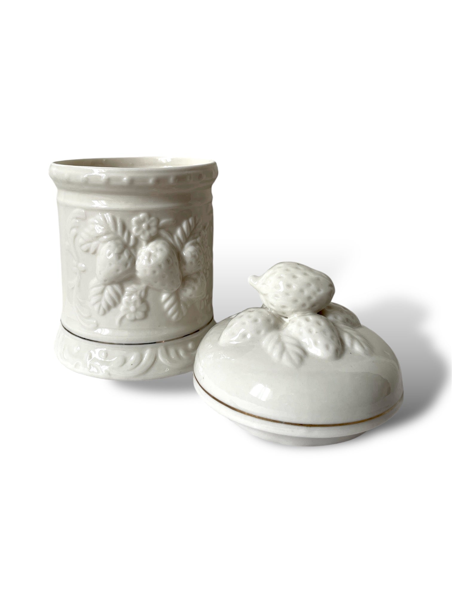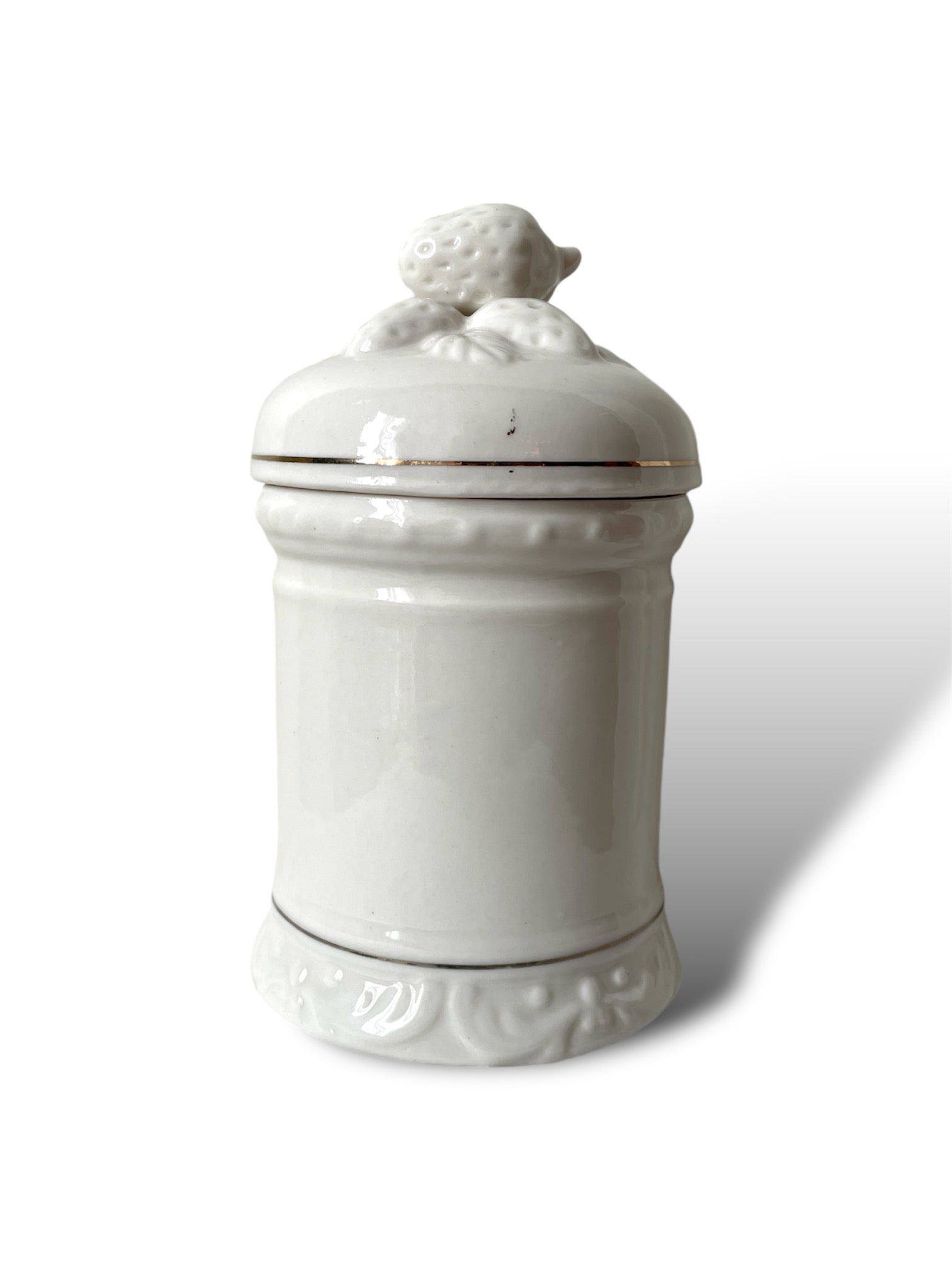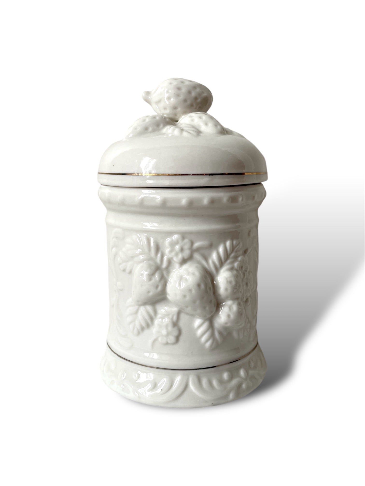 Joli pot en porcelaine blanc orné de motifs fraises en relief et de fines lignes dorées.