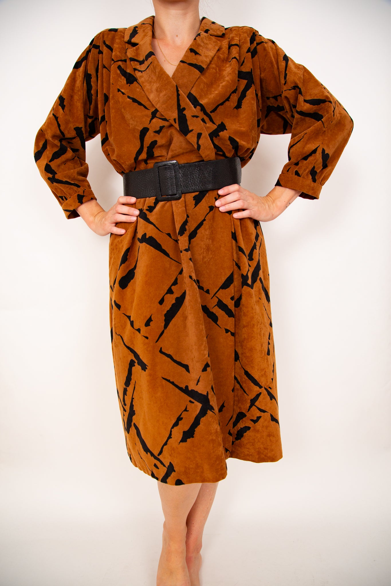 Jolie robe portefeuille mi-longue et à manches longues. Tissus duveté camel avec motifs noirs. A porter avec une ceinture pour une taille marquée. Chic et confortable à la fois.